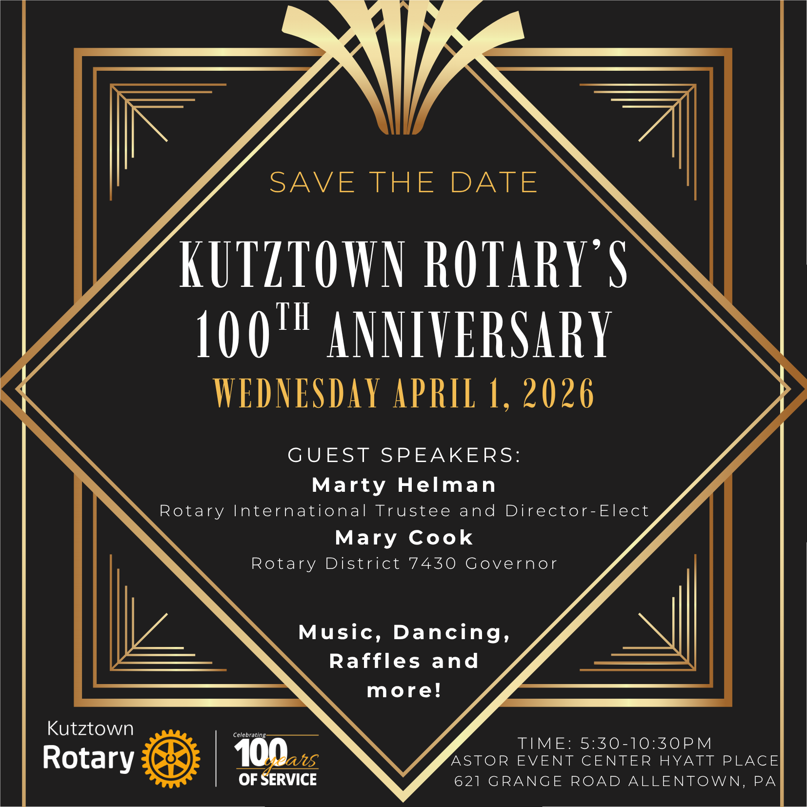 The Rotary Club of Kutztown is celebrating its 100th anniversary throughout Rotary Year 2025-2026. This Centennial includes legacy gifts, monthly service projects, and a 100th Anniversary dinner party, which will be held on April 1, 2026 at the Astor Event Center in Allentown.